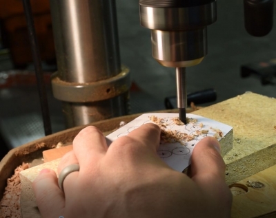 Как просверлить сквозное отверстие? Под заготовку помещают деревянный брусок, это гарантирует сохранность оснастки и защитит рабочий стол от повреждения.