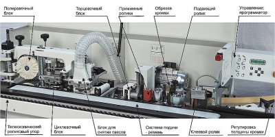 - механизма подачи материала для обработки торцов — деревянных реек, меламиновых лент, поливинилхлоридной пленки или шпона;
