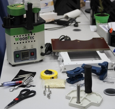 Клеевая станция устройства наносит клей на обрабатываемую поверхность кромки.