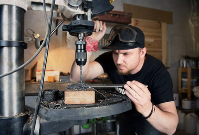 Теперь самое время надеть защитные очки, это нужно сделать до того, как сверло коснется заготовки. Ведь именно в этот момент из рабочей зоны начнет разлетаться пыль и стружка. Прозрачный щиток, который имеется на каждом станке, задерживает ее, но пыль все равно может попасть в глаза. Если у вас еще нет защитных очков, можете приобрести их в нашем интернет-магазине.