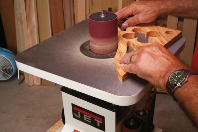 Применимы для шлифовки вогнутых кромок. Основу конструкции составляет цилиндр, вращение которого осуществляется посредством работы специальных элементов. На цилиндр установлен абразив. Преимущество настольных установок – высокая эффективность обработки материала. С помощью подобного оборудования можно избавиться от неровностей поверхности щитов, крупных деталей.