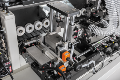 Главным элементом узла прижима является опорный ролик. Его задача — создание определенного усилия в момент контакта детали и ленты с нанесенным на нее клеем-расплавом. В станках с ручной подачей роль этого узла выполняет оператор, который наряду с подачей заготовки прижимает ее к ленте, упираясь в ролик. Чтобы правильно и качественно выполнять несколько этих операций, нужен большой опыт и соответствующие навыки. Проще дело обстоит в станках с автоматизированной подачей. Там заготовка прижимается не вручную, а с помощью специальных роликовых элементов.