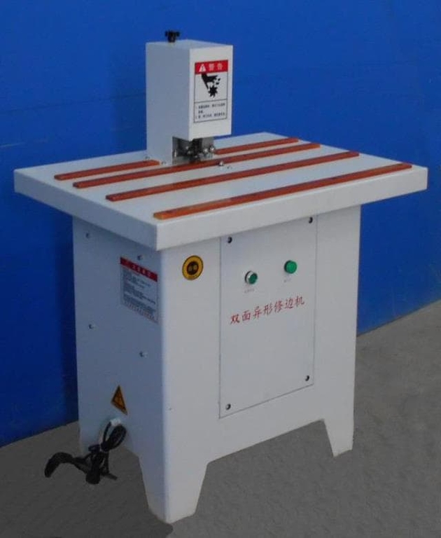 Снятие свесов производится двумя фрезами, приводящимися в движение от двух высокочастотных электродвигателей. На станке установлены ручки для регулировки толщины материла и настройки точного радиуса снимаемой кромки