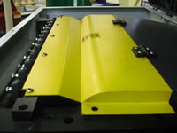 - Секционный верхний подающий валец позволяет обрабатывать одновременно несколько заготовок с разнотолщинностью до 3 мм. Перед верхним подающим вальцом установлена когтевая защита, предотвращающая обратный выброс заготовки. Обеспечивается безопасность работы станка.