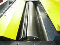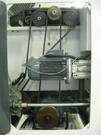 Моторный отсек. Привод ножевого вала через клиноременную передачу, привод валов подачи и подъем/опускание рабочего стола через цепную передачу. |