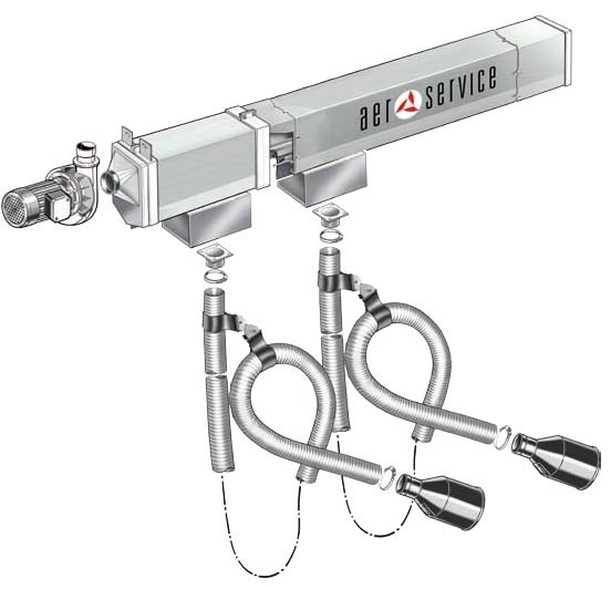 Рельсовая система вытяжки Aerservice KITCA222150280 широко используется в автомобильном секторе, потому что единственный коллектор всасывания выхлопных газов может перемещаться по многочисленным постам. Система, поставляется заранее смонтированная и полная всех необходимых конструкций для установки на стену, комплектация вентилятором связь с линией выброса паров в атмосферу.