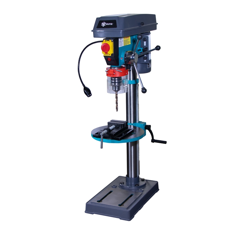 В условиях мелко и среднесерийного производства настольный сверлильный станок AURA CM-1316/220 находит широкое применение за счет своей многофункциональности, мощности и высокой производительности. Станок может быть использован практически в любых условиях — он работает от бытовой сети 220 В, имеет небольшие размеры и отличается высокой надёжностью. Возможности станка расширены благодаря функциями поворота и наклона стола. Для удобства при эксплуатации станок оснащен яркой LED подсветкой рабочей зоны и лазерным указателем. Для обеспечения безопасности станок оборудован кнопкой аварийной остановки, а так же прозрачным экраном, который обеспечивает защиту оператора и при этом не закрывает обзор. Станок комплектуется машинными тисками. Сверлильный станок AURA CM-1316/220 станет незаменимым помощником в домашней мастерской или гараже. AURA TOOLS рекомендует данный сверлильный станок для оснащения слесарных и столярных мастерских учебных заведений.