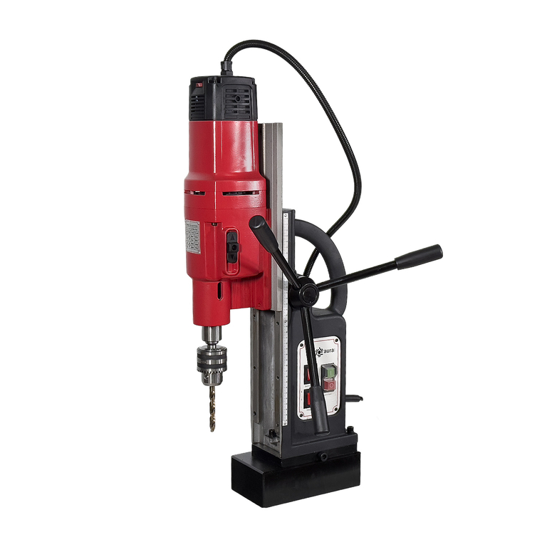 Переносной магнитный сверлильный станок AURA MCM-100R предназначен для промышленного использования, сверления отверстий до ø100 мм корончатым сверлом и до ø31,75 мм спиральным сверлом в различных сталях. Станок оснащен реверсом и позволяет нарезать резьбы до М36. Мобильность, надёжный электродвигатель мощностью 2000 Вт и массивное поворотное магнитное основание, имеющее силу притяжения 18000 H, обеспечивают уверенность в выполнении самых сложных задач. Машина имеет 4 ступени скоростей и функцию плавной регулировки оборотов в диапазоне от 45 до 700 об/мин., что позволяет точнее выбрать режим обработки, а использование имеющейся системы подачи СОЖ в зону резания, исключит перегрев режущего инструмента и продлит срок его службы. Для более точного позиционировании на закрепляемой поверхности, предусмотрена возможность смещения станины относительно закрепленного магнитного основания в диапазоне 20 мм. Безопасность работы с станком обеспечивает прочный страховочный ремень, входящий с комплект поставки. Ремнем станок фиксируется к балке или конструкции на которой он установлен, что препятствует падению машины при аварийном отключении электроэнергии.