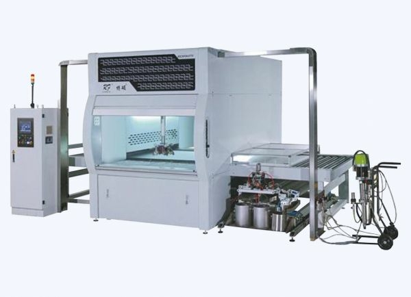 Станок оснащен окрасочным манипуляторами с 4-мя распылителями. Манипулятор совершает возвратно-поступательное движение поперек направления движения конвейера полностью окрашивая изделие.
