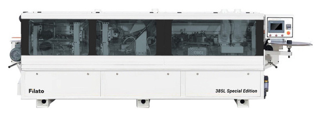Автоматический кромкооблицовочный станок Filato OPTIMA 385L SE для облицовывания прямолинейных кромок плитных материалов рулонными кромками АБС, ПВХ и полосовым кромочным материалом толщиной до 2 мм.