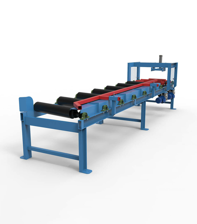 Базирующий рольганг предназначен для автоматического выравнивания в линию брусьев и досок по отношению к дисковым пилам многопильного или обрезного станка. Материал по установленным косо роликам плавно доводится до направляющей линейки рольганга. Далее брус прижатый к зубчатым роликам вводится в механизм подачи станка. Тем самым исключается использование обслуживающего персонала (Минимум одного рабочего), Улучшается качество и цикличность подачи материала.
