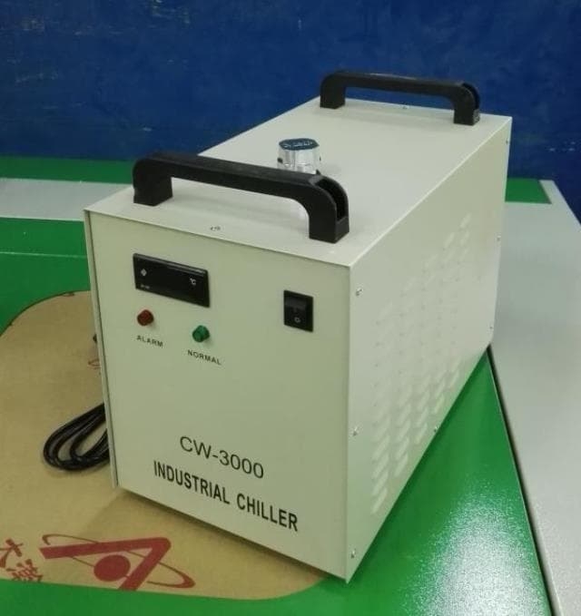 Чиллер CW-3000 используется взамен пассивной схемы охлаждения и для защиты лазерной трубки от перегрева. В корпус чиллера встроен герметичный водяной бак на 9 литров, охлаждение воды происходит за счет принудительного обдува. Для долговременной работы без перерывов на очистку и смену воды в чиллере, используйте дистиллированную воду.