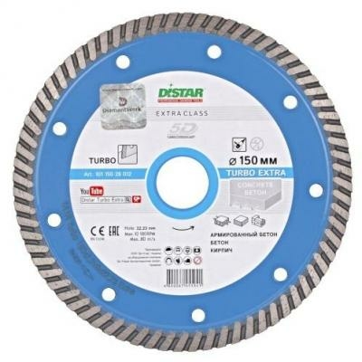 Диск отрезной алмазный 1A1R 150х2,2х9х22,23 Turbo Extra предназначен для профессиональной сухой резки различных материалов, таких как керамика, камень, бетон и другие строительные материалы.