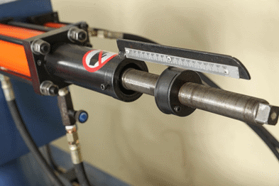 Задача угла гиба Угол гиба задается также механически путем поворота ограничителя хода гидравлического цилиндра на каждой из голов, там же интегрирована линейка с градацией. |