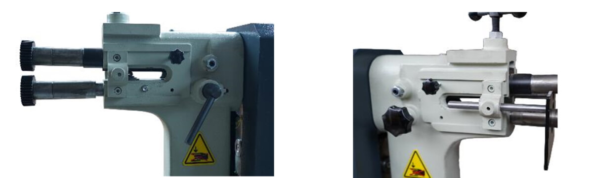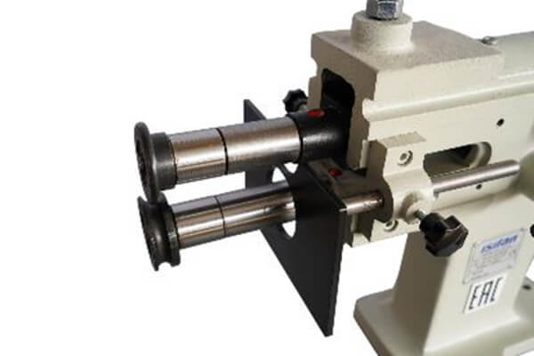Продольная регулировка нижнего вала осуществляется за счет боковой рукоятки, которая позволяет настраивать требуемый вылет нижнего ролика. Чтобы нижний вал не смещался во время работы его необходимо зафиксировать специальным маховиком. Максимальный вылет роликов станка составляет 140 мм. |
