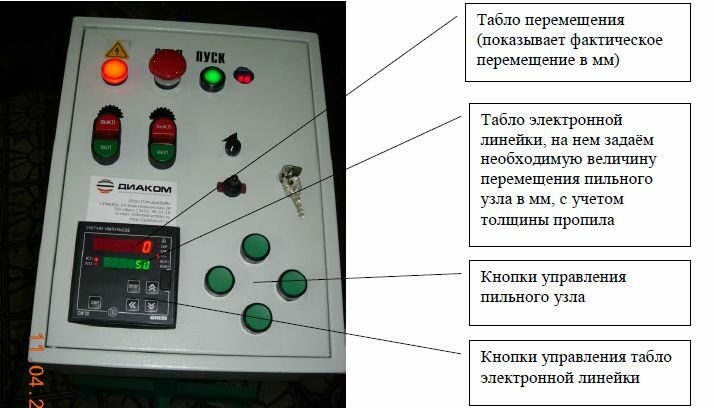 - Нажать кнопку «ПРОГ» и с помощью кнопок управления табло электронной линейки задать необходимую величину перемещения пильного узла в мм, с учетом толщины пильного диска (добавляется к толщине/ширине доски).