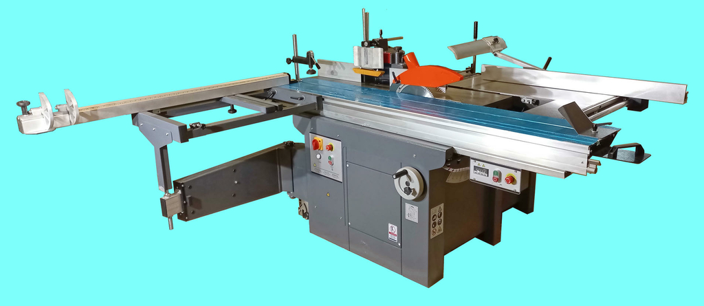 - Пильный узел включает не только основную но и подрезную пилу и имеет возможность наклона на 45о, что даёт возможность работы с ламинированными заготовками и производства мебели.