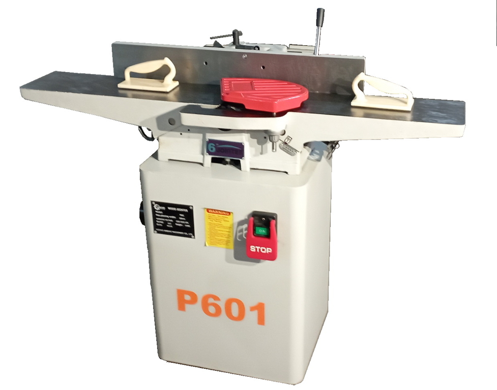 Фуговальный станок P601 предназначен для прямолинейного одностороннего строгания изделий из древесины по плоскости и снятия фасок. P601 - станок с длинными чугунными столами, предназначенный для любительского применения. Станок изготовлен по той же компоновочной схеме, что и профессиональные модели, он точен и удобен в работе. Конструктивно станок состоит из двух частей. В нижней, играющей роль тумбы-подставки, располагается однофазный асинхронный мотор и кожух сбора стружки с патрубком для подключения к вытяжной установке. Верхняя часть состоит из чугунного основания, где размещен строгальный вал, и чугунных рабочих столов с оснащением, состоящим из защитного кожуха и упора заготовки. Оба стола регулируются по высоте при помощи винтовых механизмов, приводимых в действие ручками-маховиками. Перемещением подающего (переднего) стола регулируют глубину строгания, для чего есть соответствующая разметка; принимающий (задний) смещают только при наладочных операциях во время обслуживания станка. Упор заготовки чугунный, с механизмом для регулировки наклона (он возможен в обе стороны). Фиксация выбранного положения производится резьбовым зажимом. Ножевой вал укомплектован тремя ножами. Размер ножей такой же, как и у профессиональных фуганков с аналогичной шириной строгания.