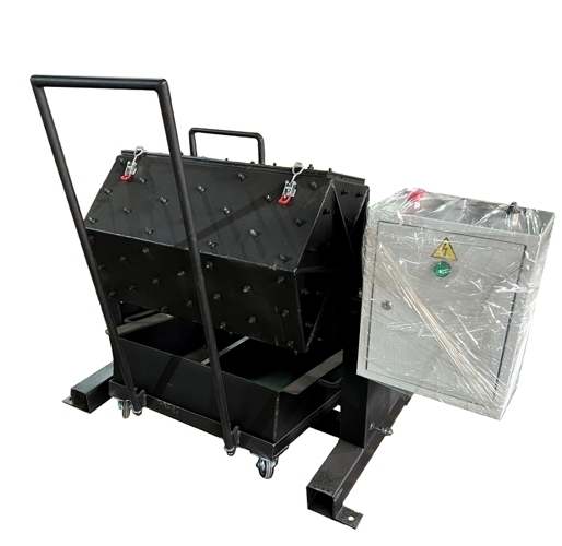 Конструкция представляет собой приводной футерованный резиной барабан, расположенный на опорах и станине. Для выгрузки деталей имеется лоток. Оборудование приводится в действие электроприводом, управление производится с кнопочной станции. Барабан рассчитан на максимальную загрузку до 120 л или до 200 кг, скорость вращения – 35 об/мин., мощность привода – 1,5 кВт.