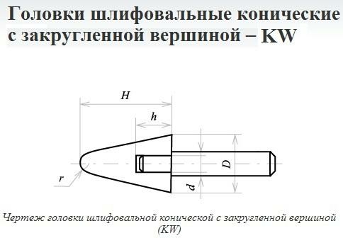 Основное назначение: обработка чугуна, цветных сплавов, стали, легированной, углеродистой, отожженной или после закалки. -(DxHxd) мм-диаметр х длина головки х диаметр хвостовика; -KW(ГКЗ)-головка шлифовальная коническая с закругленной вершиной; -25А-марка шлифовального материала из электрокорунда белого; -F60(25Н)-зернистость (среднезернистый); -O(СТ1)-твердость (среднетвердый); -ГОСТ 2447 электрокорунд белый, 25А – используется в абразивных инструментах для окончательного и профильного шлифования, резьбошлифования, заточки инструмента; ГОСТы на инструмент абразивный, алмазный, абразивные материалы. Приспособления и вспомогательный инструмент. Строительный инструмент