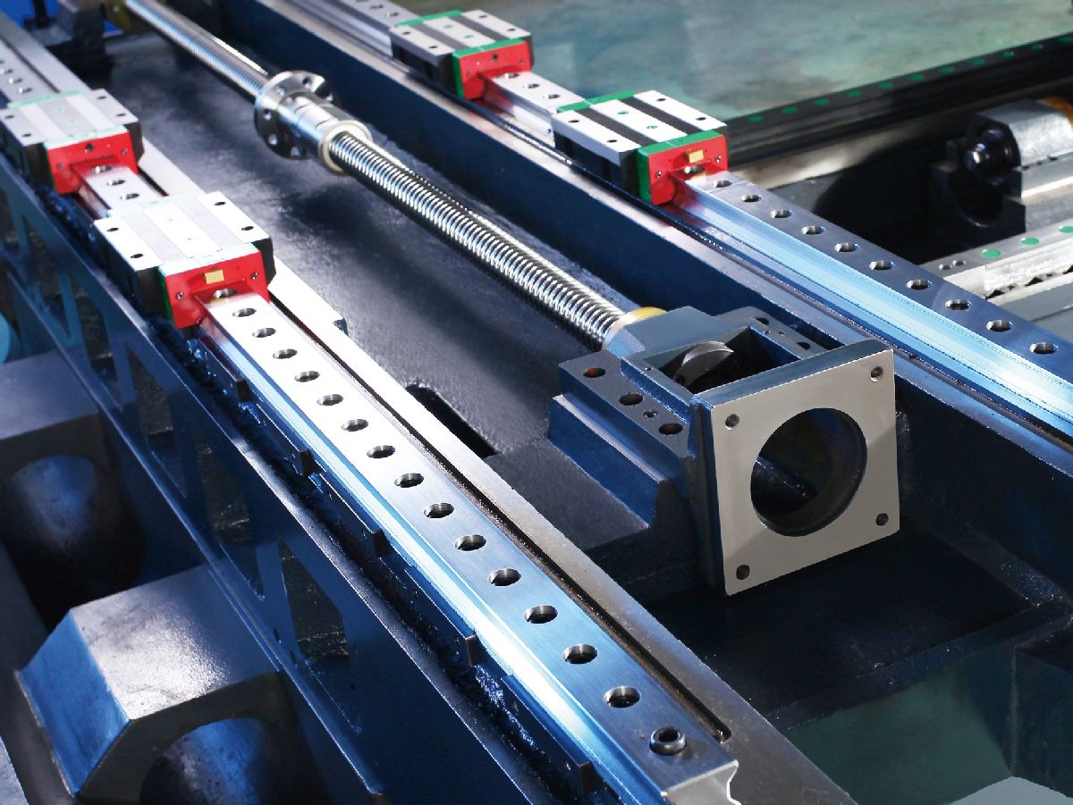 Направляющие перемещений На станках серии HMT перемещения по осям (X*Y*Z) осуществляются по роликовым направляющим, увеличенной толщины (55/45мм). В несущих блоках (каретках) четыре рядя роликов размещены под углом 45º, поэтому одинаково воспринимают нагрузку как в радиальном, так и в продольном направлениях. За счет использования линейных направляющих достигается высокая жесткость и грузоподъемность, быстрый динамический отклик, низкий коэффициент трения (0,003 ~ 0,005). |