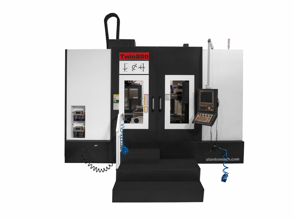 Горизонтально-вертикальный обрабатывающий центр TWIN 800 позволяют за одну установку заготовки на полноповоротном столе производить комплексную обработку инструментами установленными как в горизонтальном, так и в вертикальном шпинделях не только с пяти сторон, но и поверхностей с круговым формообразованием. Эта уникальная возможность позволяет изготавливать высокоточные изделия самых сложных конфигураций. Вертикальный и горизонтальный шпиндели имеют высокую мощность главных двигателей, до 6000 об/мин, хвостовик инструмента ВТ50, что позволяет использовать высокопроизводительный инструмент и большой съем за каждый проход. Смена инструмента в каждом шпинделе осуществляется от индивидуального инструментального магазина барабанного типа на 24 позиции каждый.