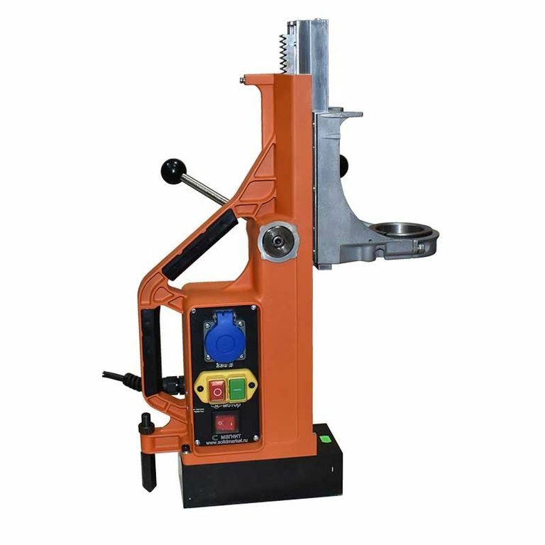 Характеристики: Мощность: 100 Вт. Масса: 15,5 кг. Ширина: 250 мм. Сила притяжения магнита: 25000 Н. Ход подачи: 320 мм. Длина: 370 мм. Высота: 520 мм. Лазерный указатель: Нет. Страна происхождения: Россия. Производитель: Хайтек инструмент. Тип магнита: электромагнит. Двойные направляющие подачи: да. Подвижное магнитное основание: нет. Крепление на трубы: через адаптер. Стойка магнитная сверлильная МСД-32.05 - это надежное и удобное изделие российского производства. Мы изготавливаем ее с 2019 года. За это время конструкция стала удобней в переноске и легче, электромагнит стал более надежным и долговечным. Преимущества: удобная для переноски и легкая станина, выполненная методом литья под давлением; мягкие силиконовые накладки на ручках для переноски; дополнительная ручка для переноски; дополнительный задний упор для большей устойчивости. Стойка сверлильная магнитного станка применяется для установки электродрелей крупного габарита, таких как BOSCH GBM-32-4, PROTOOL, METABO B32/3,REBIR IE-1206, причем дрель Rebir, имеющая посадку 70мм, может быть установлена только в нашу стойку, поскольку все выпускающиеся на Западе и Дальнем Востоке аналогичные изделия рассчитаны на диаметр шейки 65 мм, принятый за европейский стандарт, в то время, как REBIR IE-1206 - это наследие советского времени, имеет диаметр шейки немного больше. Чтобы устанавливать в стойку дрели Bosch, Protool, Metabo или Фелисатти, в комплекте идут проставные кольца для шеек диаметрами 59 и 65 мм. Облегчает работу на высоте, сверление больших отверстий, в том числе коронкой, в вертикальных стенках и над головой. Для безопасности работы, питание на розетку, встроенную в станину, поступает только после активации электромагнита. На случай прерывания подачи электричества, стойка должна быть закреплена страховочным ремнём (входит в комплект поставки). Работать с компанией Хайтек инструмент комфортно и выгодно: Являемся производителями магнитных станков, фаскоснимателей и других агрегатов, а также напрямую поставляем импортные товары от производителей. Имеем большой складской запас - более 6000 позиций в наличии. Собственное конструкторское бюро и парк станков. Проводим тщательные испытания каждого товара, отвечаем за качество оборудования и уровень обслуживания. Есть своя служба доставки и сервисный центр. Работаем почти без выходных, заказ обрабатываем сразу после поступления. Опыт работы компании - более 20 лет, поэтому можем предоставить наиболее полную техническую информацию и выгодные цены. Принимаем наличный и безналичный расчет, платежи с НДС 20%. Возможна оплата наличными экспедитору в пределах Московской и Владимирской областей. Осуществляем бесплатную доставку по Москве и Московской области при сумме счета от 30 000 рублей. Возможна доставка до ТК Деловые линии, ПЭК и пр. Доставка до терминала в Ногинске или Электростали осуществляется бесплатно при сумме отгрузки от 10 000 рублей. Предоставляем возможность проверить любую технологию на нашем производстве или с выездом на объект заказчика перед оплатой.