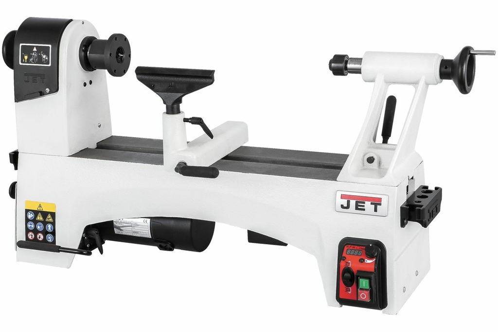 – компактный токарный станок с увеличенным диаметром обточки, созданный на базе модели JWL-1221VS. При схожих с ней габаритах он позволяет обрабатывать детали диаметром до 14 дюймов: чаши, блюда, тарелки и прочие предметы, для изготовления которых большая длина базы не нужна. Станок относится к новой профессиональной линейке Jet и сочетает современную управляющую электронику с улучшенной механической частью. У него значительно увеличена жёсткость: в сравнении с аналогами предшествующей серии, станина стала шире, а общая масса выросла на 10 кг; использованы более мощные подшипники шпинделя. Скорость вращения можно регулировать с помощью встроенной электроники, при этом выбранное значение отображается на цифровом дисплее. На панели управления расположен и переключатель реверса, который незаменим при некоторых видах работ, например, при шлифовании. Передача вращения от двигателя на шпиндель производится 6-ручейковым поликлиновым ремнем, для выбора силового диапазона трансмиссии предусмотрено три пары шкивов. Ремень переставляют без использования вспомогательного инструмента: за натяжение отвечает рычаг с храповой фиксацией. Эксцентриковые системы крепления подручника и задней бабки делают их настройки столь же простыми и быстрыми. Есть делительное приспособление с подпружиненным штифтом фиксации шпинделя, что также упрощает монтаж / демонтаж на шпиндель планшайбы (для этого требуется всего один ключ). Для станины и подставки станка можно докупить удлинения, в этом случае максимальное межцентровое расстояние увеличится до 1010 мм.Особенности токарного станка JET JWL-1421VS