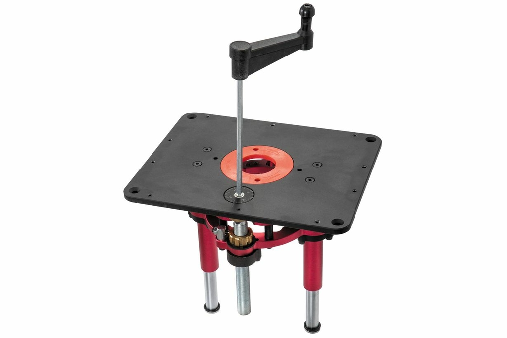 Фрезерный лифт Jet JRMLS-1 предназначен для выполнения точных и качественных фрезерных работ. Идеально подходит для использования в производственных цехах, мастерских, строительных компаниях и других областях, где требуется высокая производительность и точность. Не упустите возможность приобрести фрезерный лифт Jet JRMLS-1 уже сегодня и обеспечьте себе эффективное и надежное оборудование для вашего бизнеса! Крепежная пластина с механизмом подъема и опускания JRMLS-1 для установки в стол фрезерного мотора JRM-1 или другого подобного с цилиндрическим корпусом диаметром 98-107 мм. Для монтажа устройства в поверхности делают вырез по размеру пластины и закрепляют с тыльной стороны монтажные кронштейны. Пластину кладут сверху и выравнивают заподлицо, вращая девять регулировочных упоров, после чего ввинчивают и затягивают крепежные винты. С верхней стороны расположено отверстие для рукоятки подъема/ опускания и шкала с угловой разметкой для контроля. Один оборот ручки перемещает мотор на 1/16 дюйма или примерно на 1,6 мм. Ходовой винт оборудован гайкой, играющей роль концевого упора; она вращается от руки, после ослабления стопорного винта. Круглое окно диаметром около 100 мм служит для замены фрез и закрывается кольцом-проставкой, оно фиксируется поворотом на защелках. Штатное с внутренним отверстием 50 можно заменить на другое.Преимущества Jet JRMLS-1
