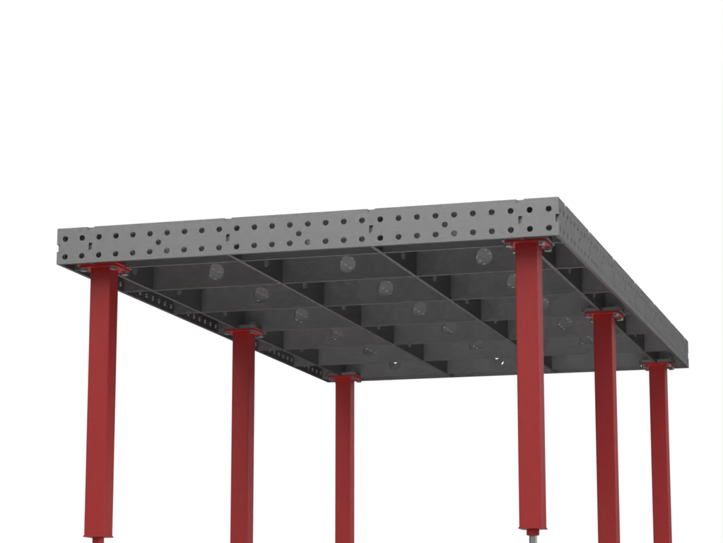 Сварочно-сборочный стол от Keepler-Stan предназначен для позиционирования и фиксации деталей и узлов металлических конструкций, а также для позиционирования роботизированной сварки. Усиленная ребрами жесткости столешница имеет отверстия диаметром 16мм и координатную сетку с шагом 50 мм для использования ее в качестве шаблона а так же нанесена линейка по длинной стороне стола для удобства позиционирования деталей. Толщина и высота ребер жесткости соответствует толщине столешницы и заявленной высоте боковой стенки. Допустимое отклонение по плоскости столешницы 1мм на 1 пог.м. стола. Высота стола 900мм, с возможностью регулировки 50 мм.