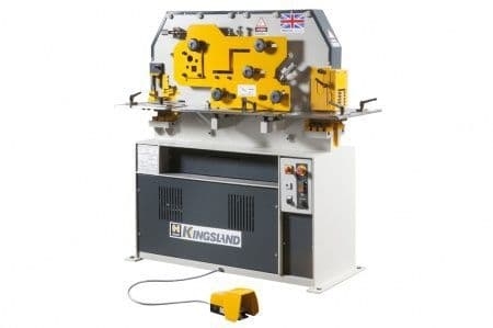 Стальная сварная станина. 5 рабочих секций: пробивка, резка полосы (секция ножниц), рубка уголка, рубка профилей, секция высечки прямоугольника. На станке могут работать 2 оператора: имеется 1 гидравлическая система с 2-мя рабочими цилиндрами и 2 педали с 2-х сторон станка. 1 рабочий цилиндр отвечает за работу секции пробивки, 2-й - за 3 секции резки профилей, уголка и полосы и секцию высечки. В случае одновременного нажатия на педали 2-мя операторами усилие станка делится пополам. Полосу и уголок можно рубить под 90 и 45 градусов. Имеется централизованная система смазки (смазка системы за 1 нажатие).