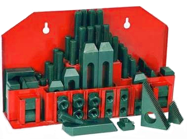 Комплект прихватов М-10 TRIOD, артикул: 574210, для фиксации заготовок, деталей сложной формы при дальнейшей обработке на фрезерных, сверлильных и других станках, имеющих ширину паза 11.7-12 мм на столе. Для удобства работы набор располагается на открытой подставке.