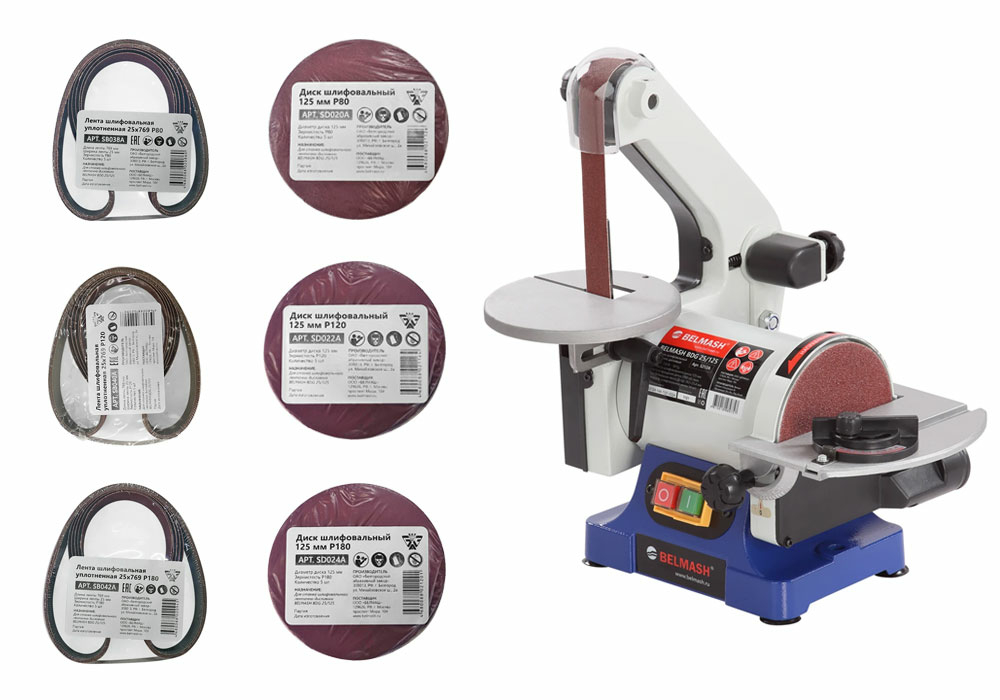 Приобретая комплект вы получаете выгодную цену на станок BELMASH BDG 25/125 и на запасные комплекты шлифовальных дисков и лент.