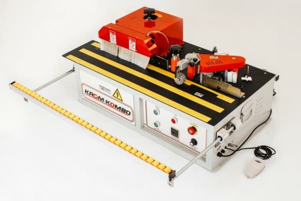 "KROM-KOMBO" подходит для производства мебели, дверей, оконных рам и других изделий, требующих облицовки кромки.Особенностью модели KROM-KOMBO является автоматическая подача заготовок по конвейерной ленте через узел кромкооблицовки. Таким образом ускоряется и упрощается работа на этапе кромкооблицовки и улучшается качество за счет исключения человеческого фактора. Станок компактного размера и работает от сети в 220 вольт. Так же нужен компрессор для работы гильотины. Скорость кромкооблицовки до 6 метров в минуту. Рекомендуем установить его в расширительный стол для работы с большими деталями.