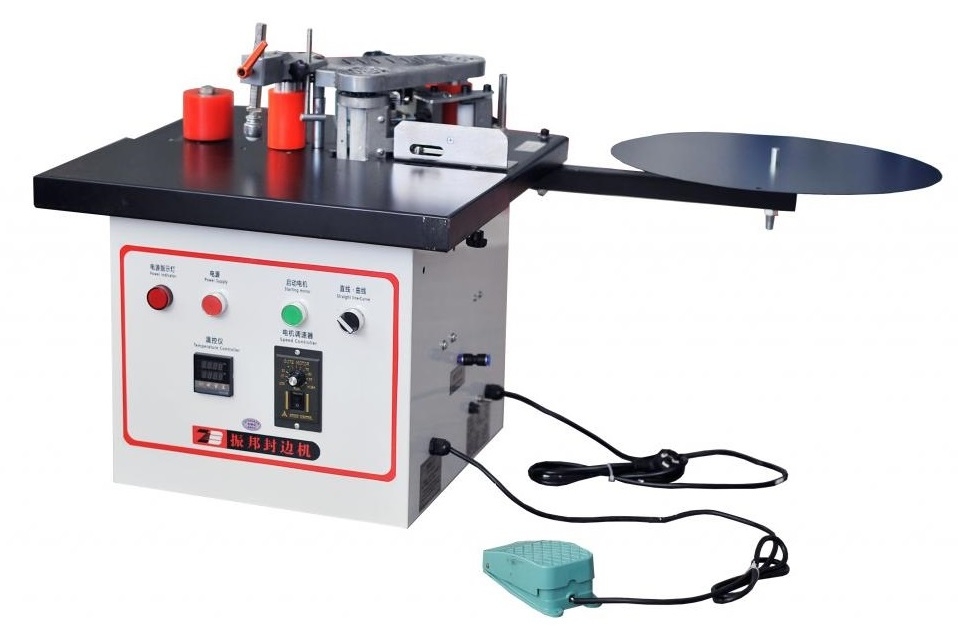 Предназначен для нанесения кромкоооблицовочного материала на прямолинейные и криволинейные заготовки. Кромкооблицовочный материал – лента ПВХ, АБС, меламин, шпон. Нанесение кромочного материала возможно с помощью подачи заготовок вручную. Подача и обрубание кромочного материала осуществляться от педали, концевика или таймера. Обрубание кромки из рулона осуществляется с помощью пневматической гильотины. Воздух из компрессора подается через блок очистки воздуха. В качестве облицовочного материала применяют ленту из ПВХ, АБС, меламина и натурального шпона шириной от 10 до 60 мм и толщиной от 0,3 до 3 мм. Применяется на мебельных производствах от мелких (в качестве основного кромкооблицовочного станка с возможностью работать с напряжением 220В) до крупных (в качестве вспомогательного кромкооблицовочного станка на однотипных операциях с криволинейными заготовками, дополняя более производительный автоматический станок).