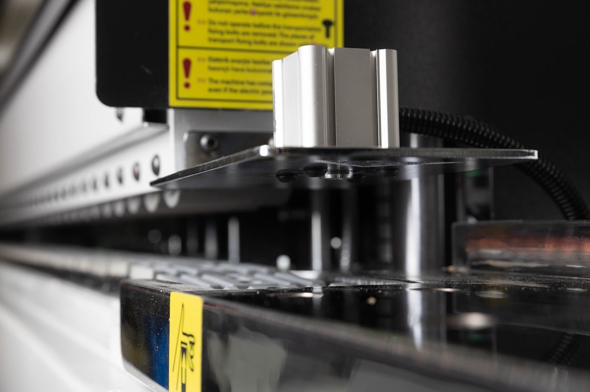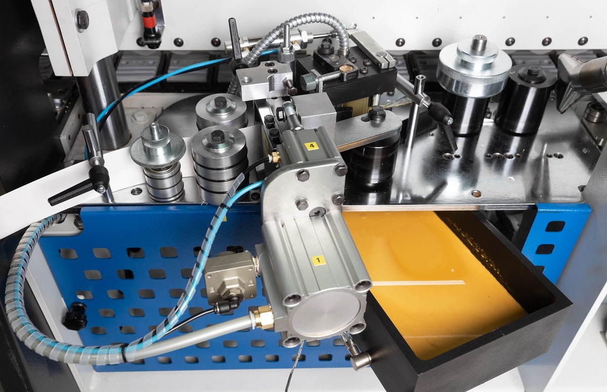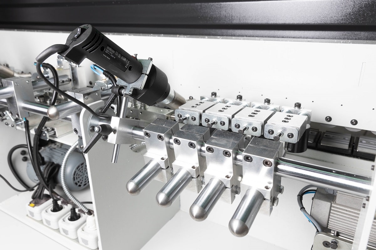 ПРЕСС ГРУППА Состоит из приводного ролика, который вращается одновременно с конвейерной лентой и одинаковой скоростью обеспечивая приклеивание кромки в момент соприкосновения с торцом двери без ударов и замятий на углах. Серия подпружиненных на пневматики направляющих в виде утюжков оснащаются тэнами для подогрева кромки с нанесенным клеем, а также двумя промышленными фенами. За счет равномерного прогрева кромки во время всего этапа софтформинга по торцу двери кромка имеет возможность сформировать угол ровно под 90° без закругления и завоздушивания.