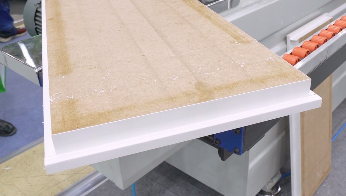 УЗЕЛ ФРЕЗЕРОВАНИЯ СВЕСОВ (ЧЕРНОВОЙ) При использовании неправильно подобранной ширины кромки свес на верхней поверхности детали выступает больше положенного, что приводит к тому, что мотор и фреза не справляются с общим объемом съема. В следствии чего узел на высокой скорости может не успеть обработать кромку и подпрыгнуть, образуя на детали бугорок (необработанную часть кромки). Благодаря разделению на черновую и чистовую обработку заготовки усилие распределяется, что приводит к увеличению моторесурс фрез, а также обеспечивает более качественную и стабильную работу без зарезания, подпрыгивания и дефектов. |