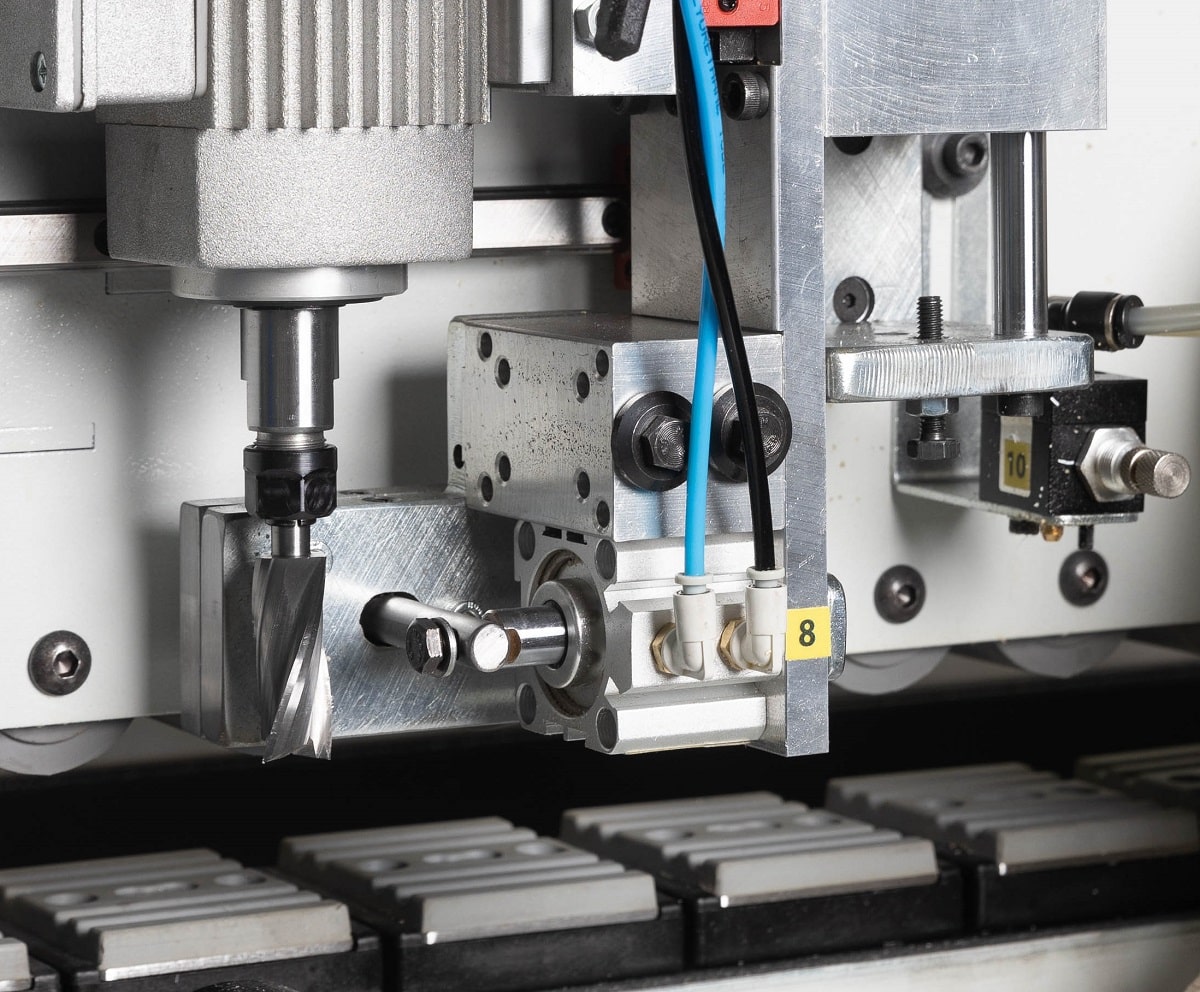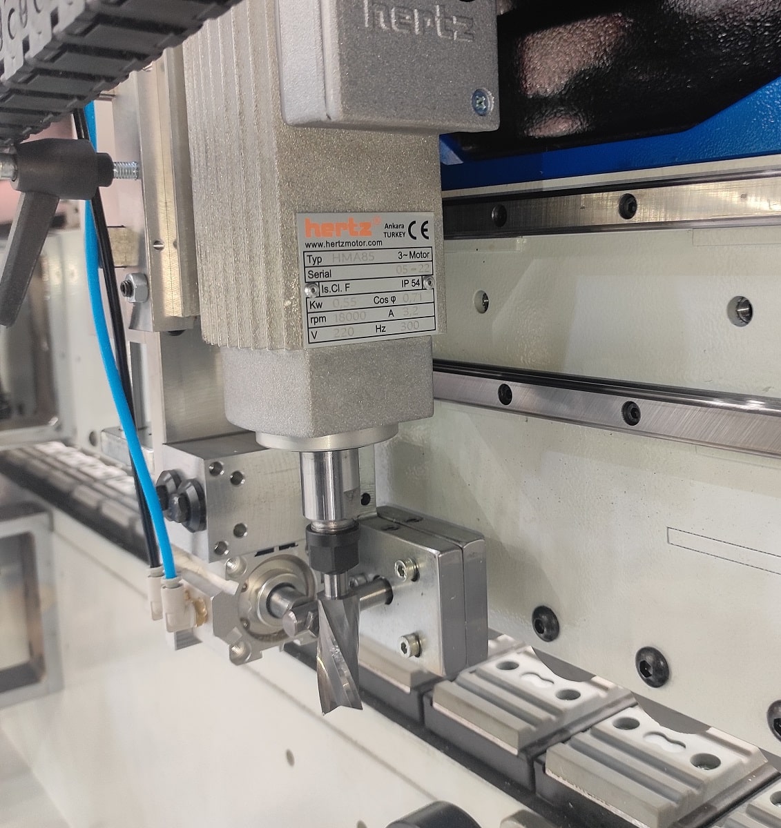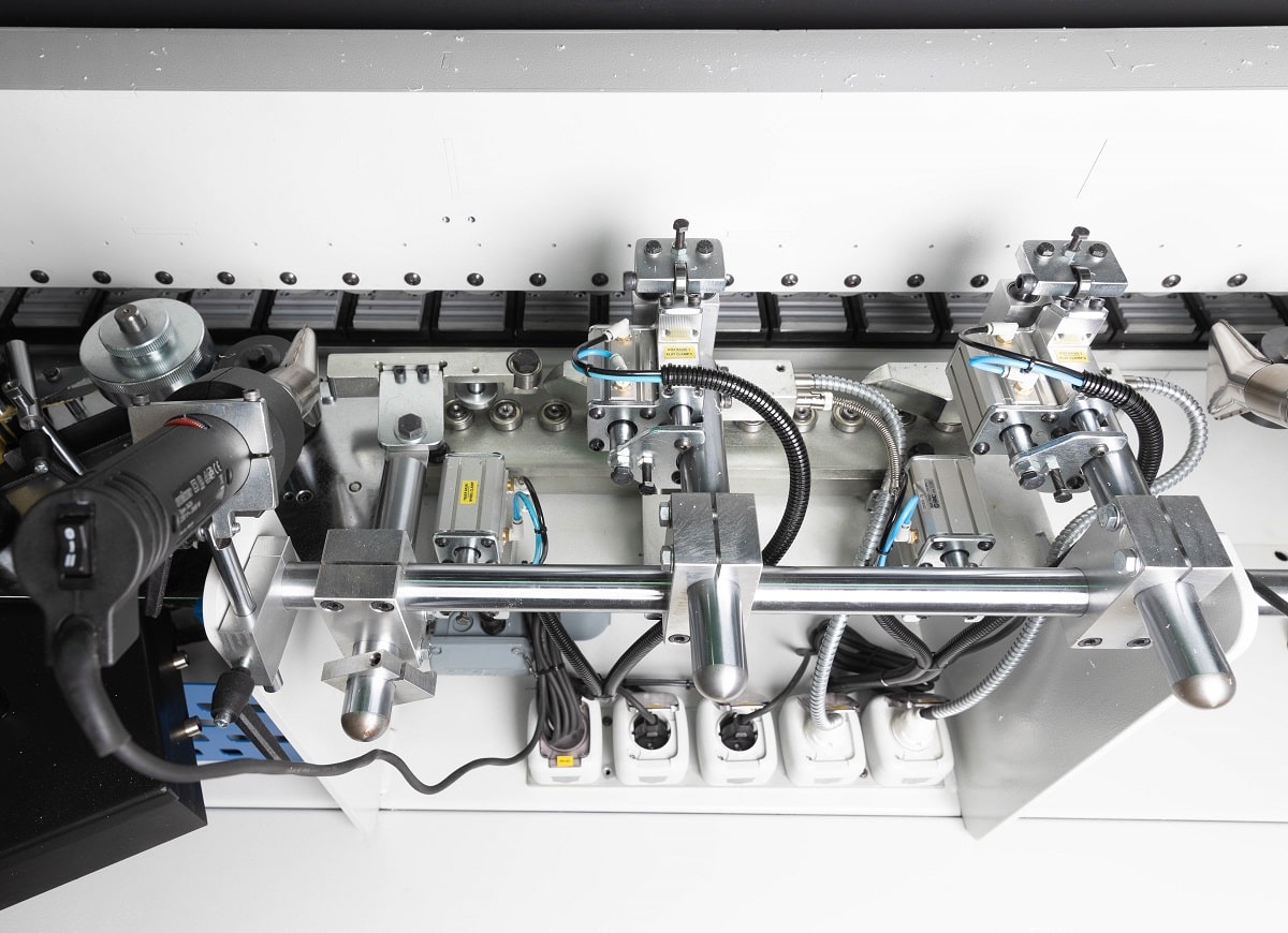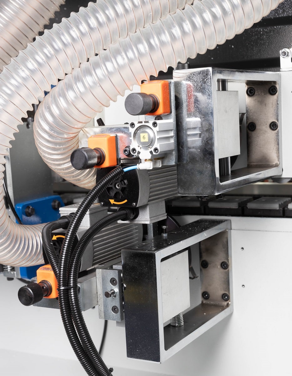 ФРЕЗЕРНЫЙ УЗЕЛ ОБРАБОТКИ ЧЕТВЕРТИ Вовремя кормлено дверей с четвертью торцовочного узла недостаточно, для этих целей на станке установлен специальный фрезерный узел обрабатывает внутренних свесов по торцу. Данный узел позволяет деликатно обработать кромку в труднодоступном месте, в котором штатным инструментом обыкновенного кромкооблицовочного станка не достать. Агрегаты перемещаются по призматическим линейным направляющим. Подход фрезы к внутреннему торцу двери во время обработки осуществляется при помощи уникальной системы двойного копира. Благодаря чему точность позиционирования фрезы относительно заготовки увеличивается, а плавность отхода при срабатывании пневмоцилиндра позволяет стабилизировать обработку. Узел оснащен двумя премиальными высокобортными двигателями от Турецкого производителя Hertz.