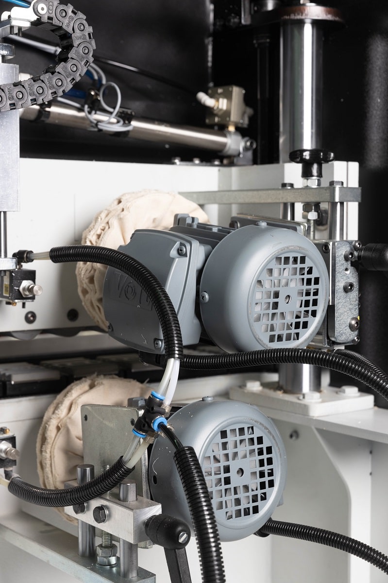 ПОЛИРОВАЛЬНЫЙ УЗЕЛ Узел полировки оснащается двумя кругами из двухслойной ткани, которые необходим для удаления излишков выдавившегося клея на поверхность детали во время прижатия и формирования кромки на пресс группе. Данный узел осуществляет финишную обработку кромки придавая блеск и отчищая поверхность сглаживая неровности и уменьшая клеевой шов.
