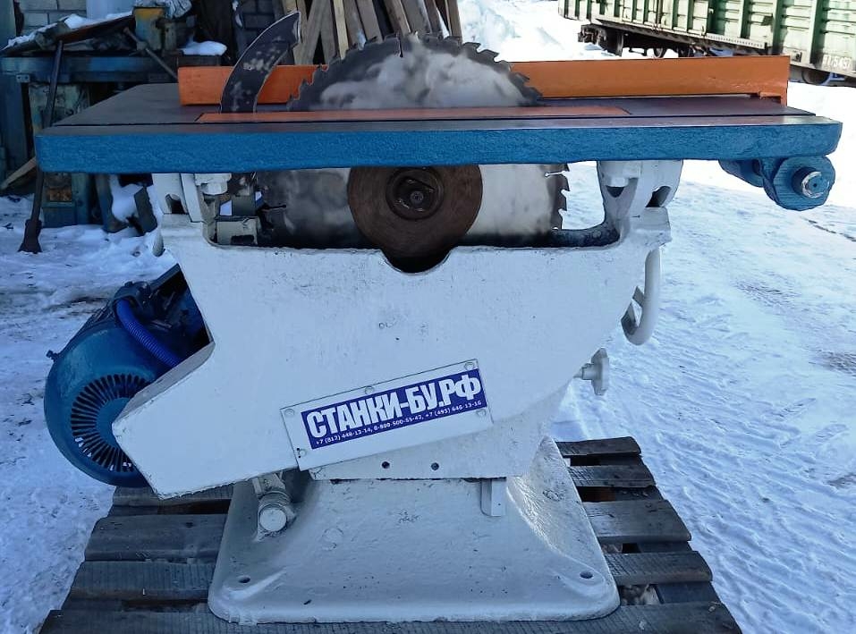 Жесткая сварная станина станка коробчатой формы. Сверху установлен рабочий чугунный стол. Направляющая линейка усиленной конструкции крепится на столе; товара Наличие ограждение пилы с патрубком для стружкоотсоса; Когтевая защита от обратного выброса заготовки; Суппорт с приводом и механизм регулировки степени выступания пильного диска над столом станка расположен внутри станины на подмоторной плите. Применяется в столярных цехах малой и средней производительности.