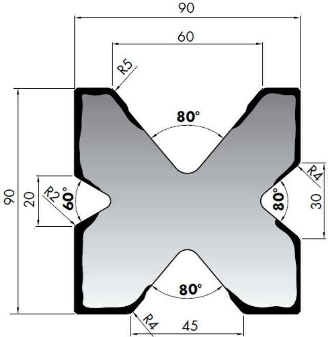 На данной матрице возможна гибка листового металла на угол от 60° до 180°. Необходимый угол гибки может быть задан конкретной величиной вертикального перемещения траверсы листогиба, углом пуансона, закреплённого на ней, а также углом пружинения конкретного материала, который подвергается гибке.