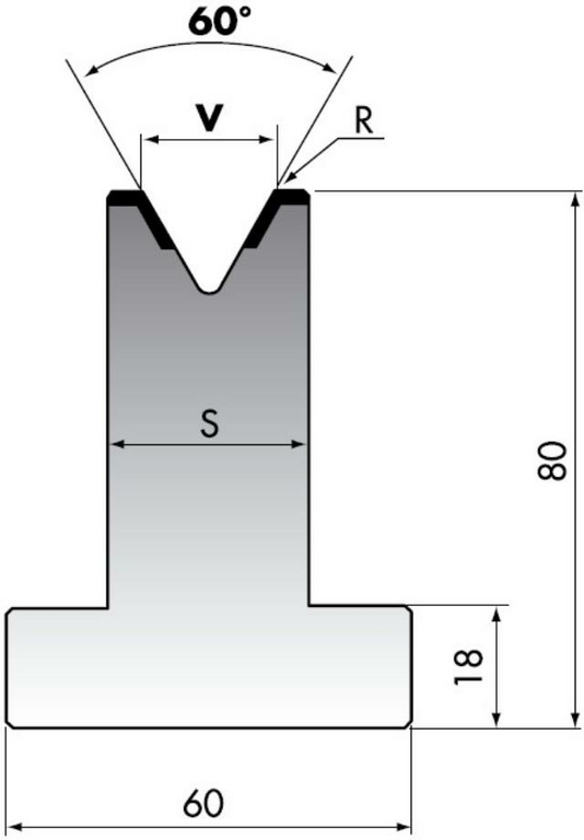 Матрица для листогибочного пресса Rolleri TR80-10-60 с одним раскрытием (ручьём) малой ширины предназначена для гибки малых и средних толщин листового металла. Не имеет возможности поворота. Изготовлена из качественной конструкционной стали C45 (560 - 710 Н/мм2). Рабочие поверхности закалены методом индукционной закалки до HRC 54 - 60 (1980 - 2200 Н/мм2). Все рабочие, крепёжные и стыковочные поверхности матрицы шлифованы.
