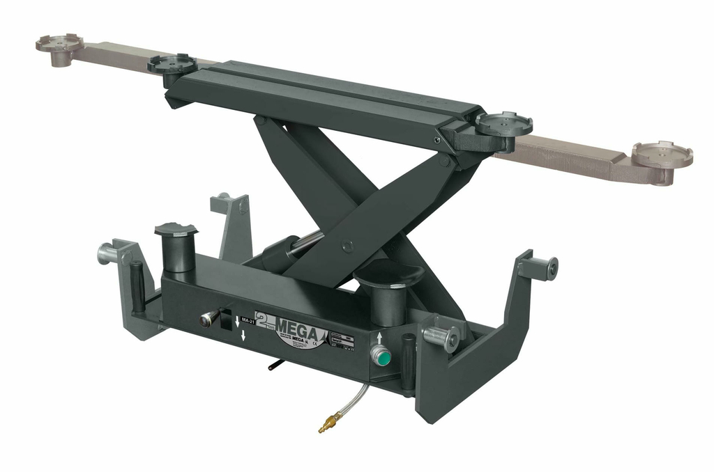 Траверса Mega MA-2 может использоваться на четырехстоечном подъемнике или на яме и предназначена для вывешивания осей автомобиля при проведении процедуры «сход-развал», замены тормозных механизмов, а также других видов работ с подвеской автомобиля. Регулируемые по ширине салазки позволяют устанавливать траверсу практически на любой четырехстоечный подъемник или стандартную яму. Для этого необходимо убедиться в соответствии профиля роликов, максимальной и минимальной ширины требуемым параметрам для конкретного подъемника или ямы. Выдвижные опорные лапы позволяют точно позиционировать траверсу под точки подхвата на кузове автомобиля. Входящие в комплект удлинители размером 100 мм используются для подъема автомобилей с высоким кузовом, например, внедорожников. Пневматический привод гидравлического насоса уменьшает время подъема, тем самым экономит время оператора.