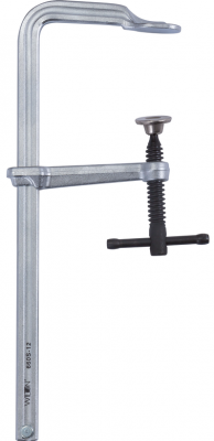 Слесарная F-образная цельнометаллическая струбцина с усилием зажима до 300 кгс. Неподвижная часть захвата образована отогнутым участком направляющего профиля и имеет отформованную площадку-упор. Профиль полнотелый из высоколегированной инструментальной стали сечением 20х10 мм с долами для облегчения. Подвижная часть захвата перемещается свободно и блокируется за счет расклинивания под усилием разжима. Для более надежной и четкой фиксации рабочая поверхность имеет насечки. Винтовой механизм с упорной трапециевидной резьбой и металлическим воротком.