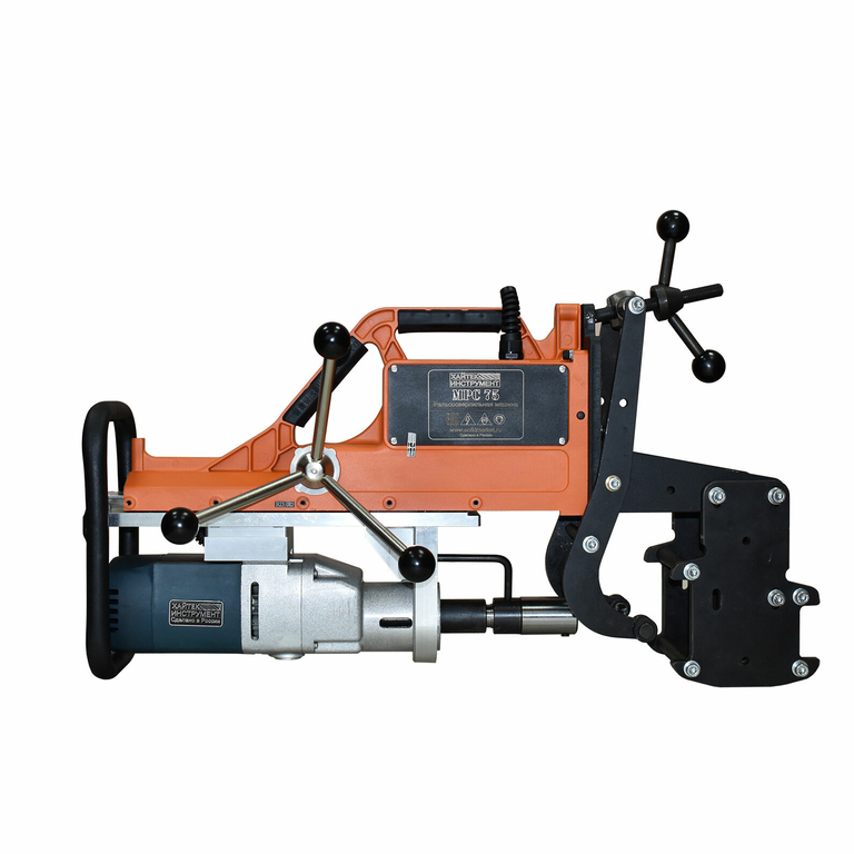Машина для сверления железнодорожных, трамвайных и крановых рельсов, до КР 120 включительно, МРС-75 предназначена для просверливания отверстий под стыковые и соединительные болты в различных рельсах. Работу этого, относительно легкого рельсосверлильного станка обеспечивает однофазный коллекторный электродвигатель мощностью 2000 Вт. Рабочим инструментом являются корончатые сверла, обладающие большей производительностью и меньшим энергопотреблением, чем традиционные спиральные. Для машины подходит большинство производимых мировой промышленностью рельсовых сверл с хвостовиком Weldon 19 (19,05 мм). Мощность двигателя и диапазон частоты вращения шпинделя обеспечивают быстрое и надежное сверление отверстий диаметром от 8 до 36 мм в объемно-закаленных рельсах. При этом, сверление крепежных отверстий до 30 мм в крановых рельсах возможно при помощи спиральных сверл с конической посадкой. Это значительно повышает экономическую эффективность работы. Конструкция крепления позволяет быстро устанавливать и снимать машину на рельс сверху, без необходимости удаления балласта. Входящий в комплект кронштейн упорный с шаблоном для рельс Р50 , Р65 (Р75) обеспечивает требуемую по ГОСТ Р 51685-2013 и DIN 536 высоту расположения отверстий на рельсах. Также имеется возможность установки МРС-75 на другие типы рельс, шаблоны для этих рельс не входят в стандартную комплектацию, а поставлются отдельно. В отличие от бензиновых, станок МРС-75 не выделяет выхлопных газов при работе и идеален в применении в тоннелях и замкнутых пространствах. Для удобства переноски и установки на рельс, станок оборудован тремя рукоятками с резиновыми накладками.