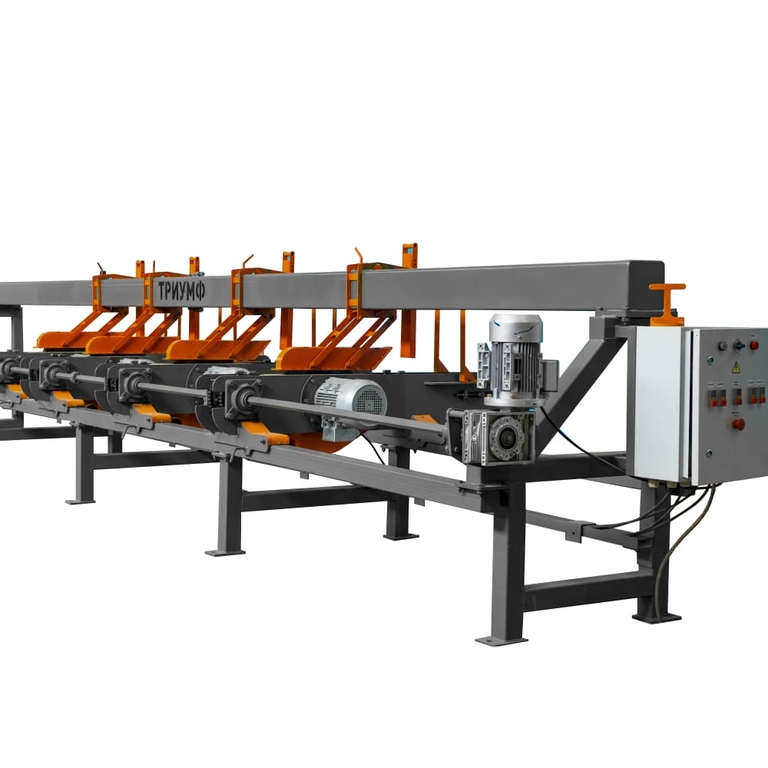 Станок мультиторцовочный проходного типа «ТРИУМФ» ТСМ 120 предназначен для точного роспуска брусьев и досок в заданный размер, при производстве погонажных изделий, паллетной заготовки и пр. (высотой до 120 мм, шириной до 250 мм, длиной до 6500 мм).