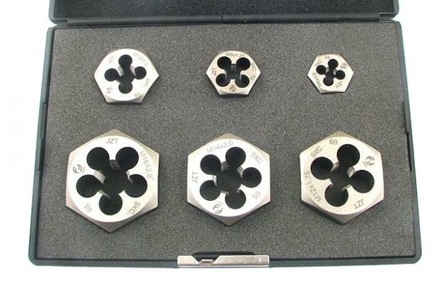 Комплектация набора: плашки шестигранные 6х1,0; 8х1,25; 10х1,5; 12х1,75; 14х2,0; 16х2,0.