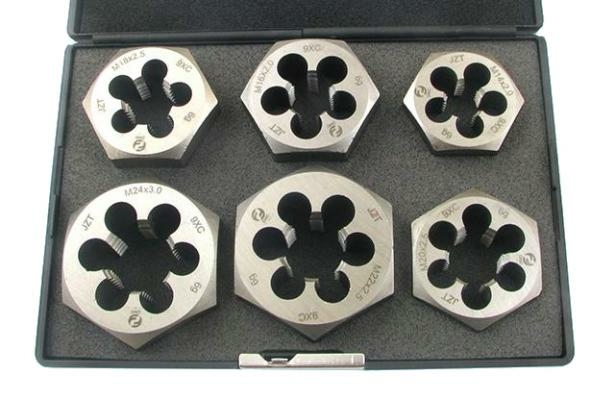 Комплектация набора: плашки шестигранные 14х2,0; 16х2,0; 18х2,5; 20х2,5; 22х2,5; 24х3,0.
