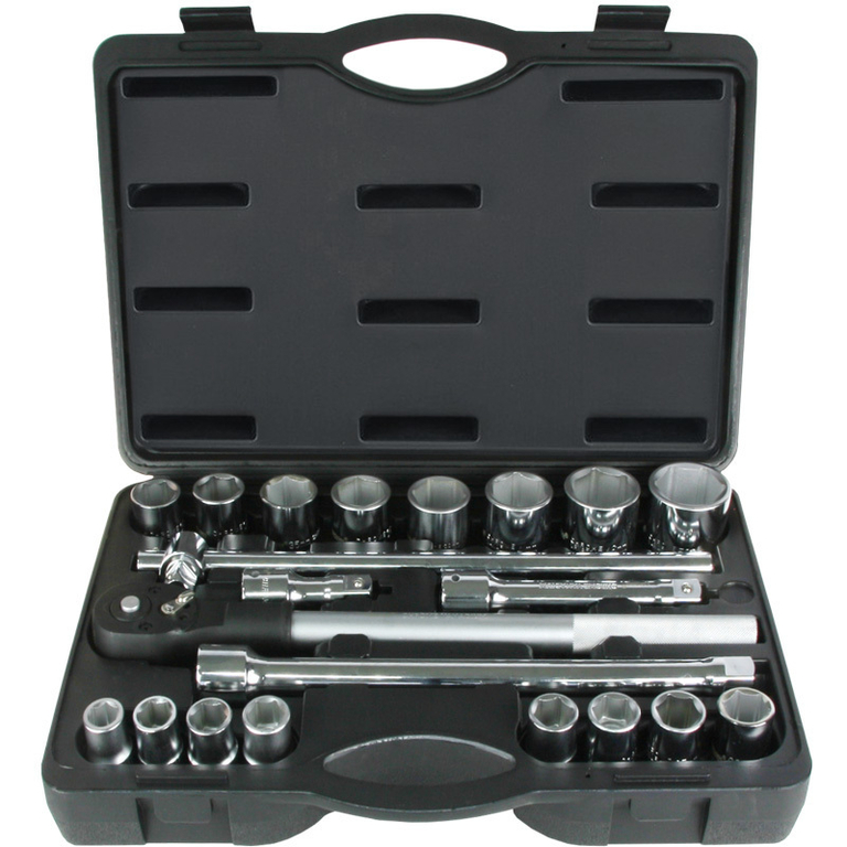 Набор головок с присоединительным квадратом 3/4 дюйма.Увеличенный размер посадочного квадрата позволяет использовать головки размерностью до 50мм.Набор уложен в удобный пластиковый кейс.Комплектация:Головки шестигранные: 19, 21, 22, 23, 24, 26, 27, 28, 30, 32, 35, 36, 38, 41, 46, 50мм - 16 шт.Вороток Т-образный - 1 шт.Вороток трещоточный - 1 шт.Удлинители - 3 шт.Набор ручного инструмента Набор инструмента 3/4" 21 предмет технические характеристики