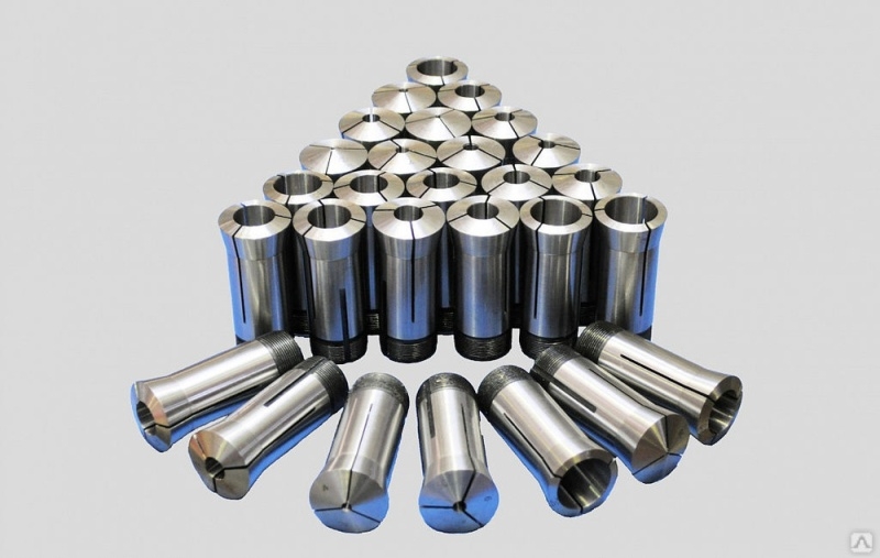 Цанга - приспособление в виде пружинящей разрезной втулки для зажима цилиндрических или призматических предметов. Со стороны головки цанга имеет осевые прорези, разделяющие лепестки — зажимные кулачки. Зажим предмета происходит под действием осевого усилия, приложенного к наружной конической части цанги. Материал – сталь. В комплект входят цанги для зажима изделий диаметров – от 1 до 28 мм.
